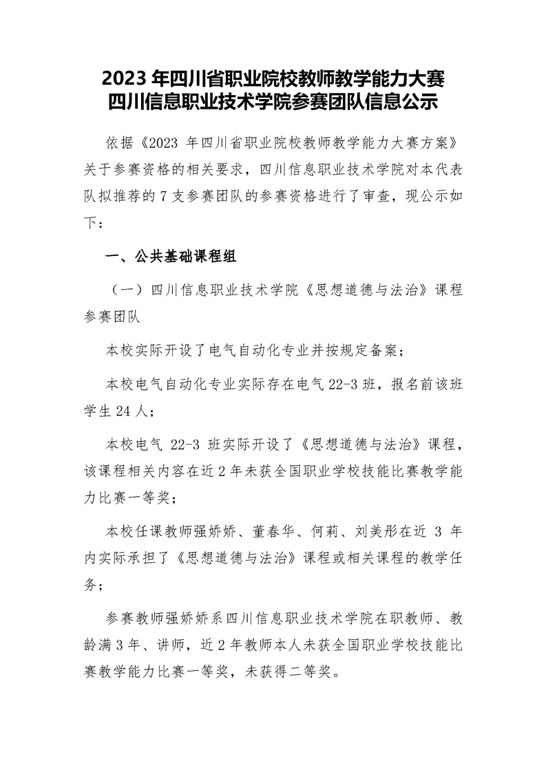 2023年四川省职业院校教师教学能力大赛我院参赛团队信息公示