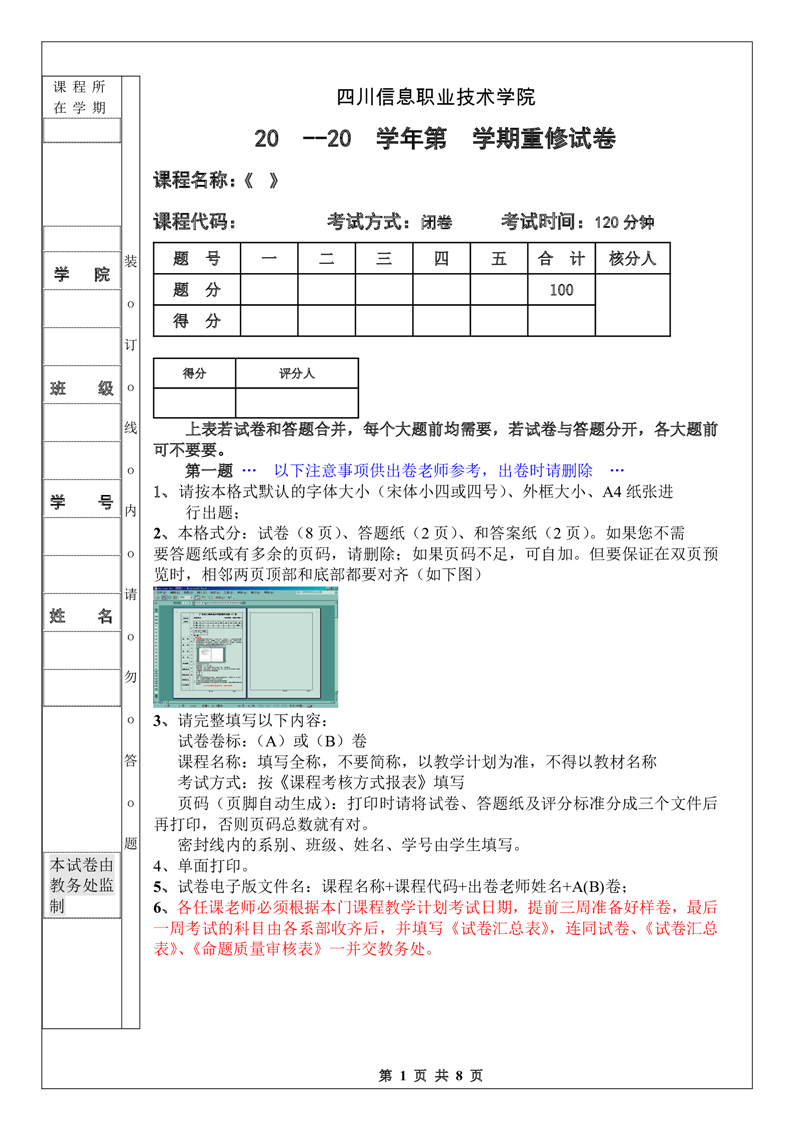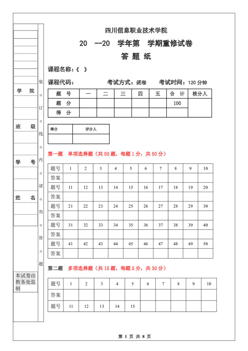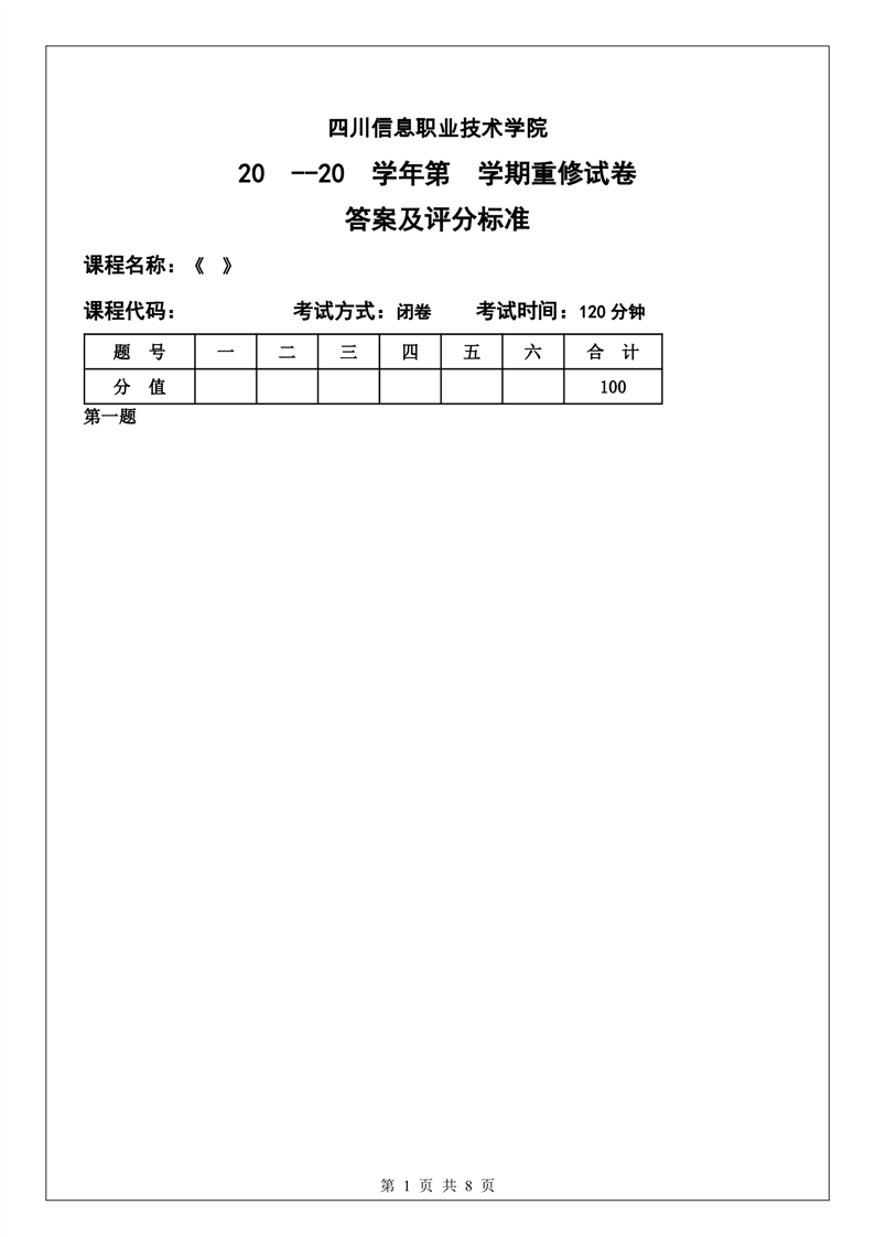 四川信息职业技术学院重修考试试卷模板